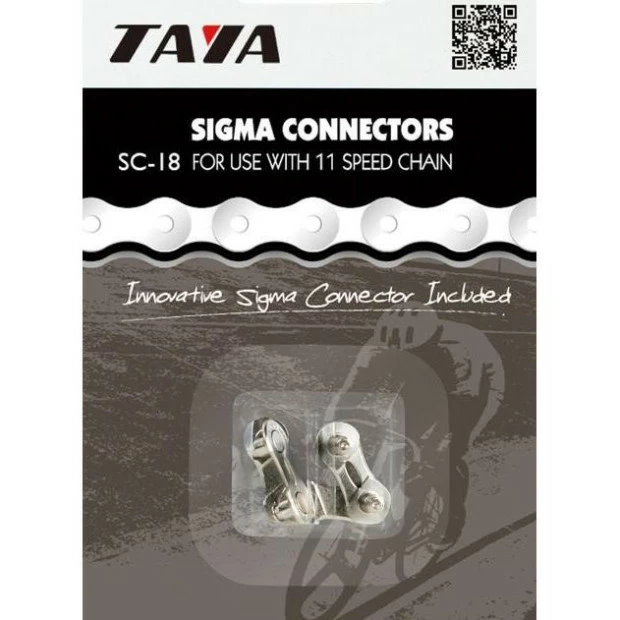 Le maillon rapide Taya Sigma connector est un brevet Taya qui a révolutionné l’installation des chaines, faisant du maillon rapide un lien aussi fort que n’importe quel autre maillon de la chaine. Il se monte rapidement et sans outil, juste en insérant le premier maillon dans la chaine, puis en installant le maillon Sigma dans les rivets et en jouant sur le maillon pour riveter la chaine.